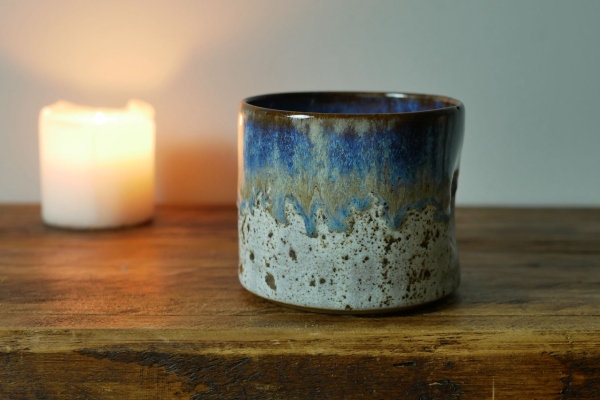 These wheel thrown stoneware thumb cups are a blend of semi-matt and gloss glazes that create the unique blend of colours.