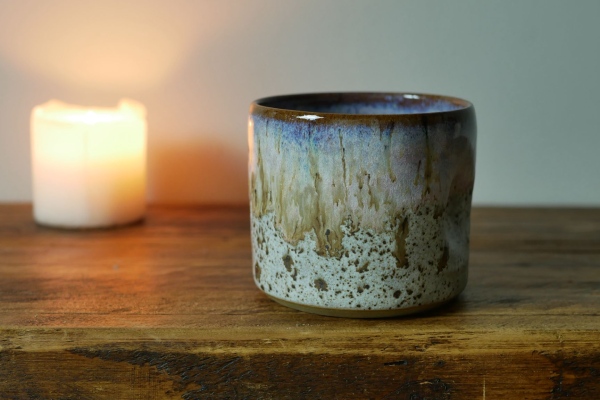 These wheel thrown stoneware thumb cups are a blend of semi-matt and gloss glazes that create the unique blend of colours.