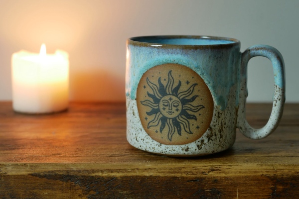 These wheel thrown stoneware mugs are a blend of semi-matt and gloss glazes that create the unique blend of colours.